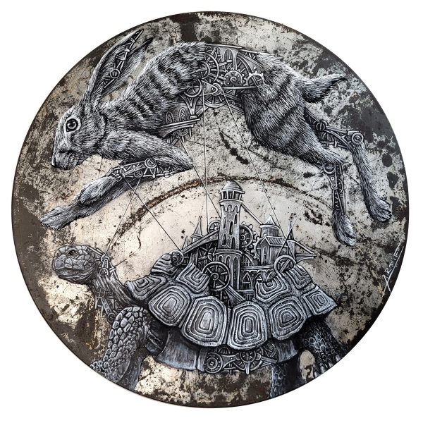 Ardif est un artiste français originaire de Paris, formé à l’architecture avant de se consacrer pleinement à la création artistique. Son univers singulier explore la rencontre entre nature et mécanisation à travers ses emblématiques mechanimals, des créatures hybrides mi-animales, mi-machines. Alliant la rigueur du dessin technique à une sensibilité poétique, il révèle la tension entre instinct vital et artificialité urbaine. Collés sur les murs de Paris et d’ailleurs, ses pochoirs détaillés interpellent par leur précision et leur équilibre, évoquant un futur où l’organique et l’industriel coexistent. Par son travail, Ardif redonne vie à la ville tout en questionnant la place de l’homme dans son environnement.