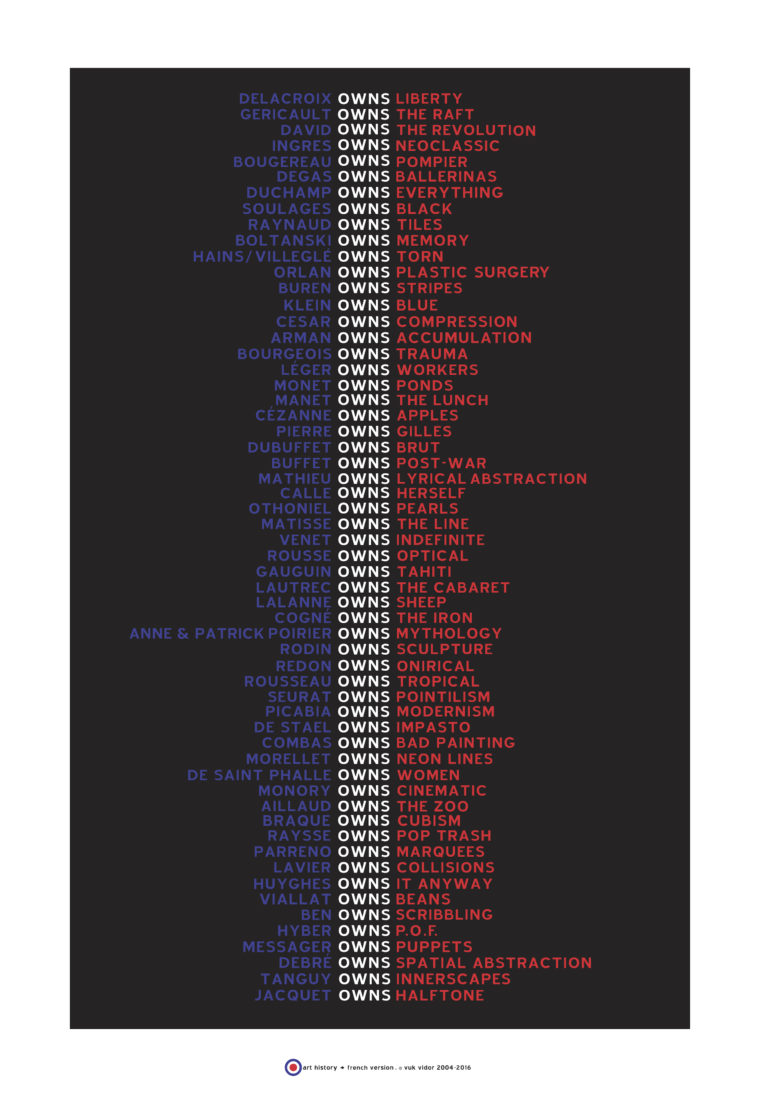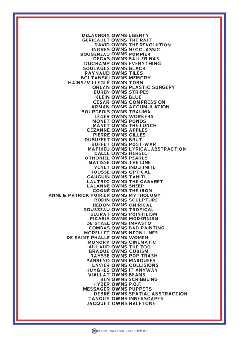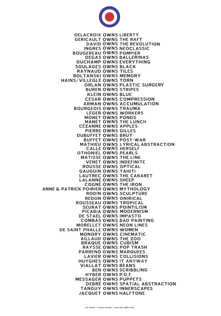 Vuillard was better than Bonnard, Tapiès was better than Bonnard, Rauschenberg was better than Rauschenberg, Twombly always painted shit, Bacon was better alive”, he asserts in a manifesto-like painting entitled Art history, presented in 1999. In 2003, he took a stand for migrants: in an installation entitled Serbia Remix Project, he depicted a blue, white and red striped plastic bag, a common feature of the victims of all the modern world’s conflicts, according to him. His work contains historical references and evokes war. In 2007, he was one of the signatories of a tribune published in the newspaper L’Humanité, in which he deplored the involvement of the Ministry of Culture in the standardization and monopoly of official art, criticized the “masked manipulators” who impose the diktat of fashion and trends, and called for a more equitable distribution of temporary exhibition venues.