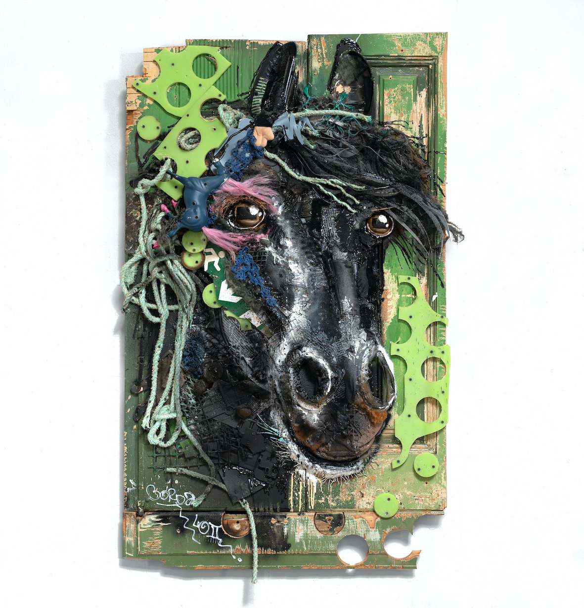 Paint over an assemblage of wasted objects (plastic, wood, and others), 164 x 94 x 24 cm, 2023
