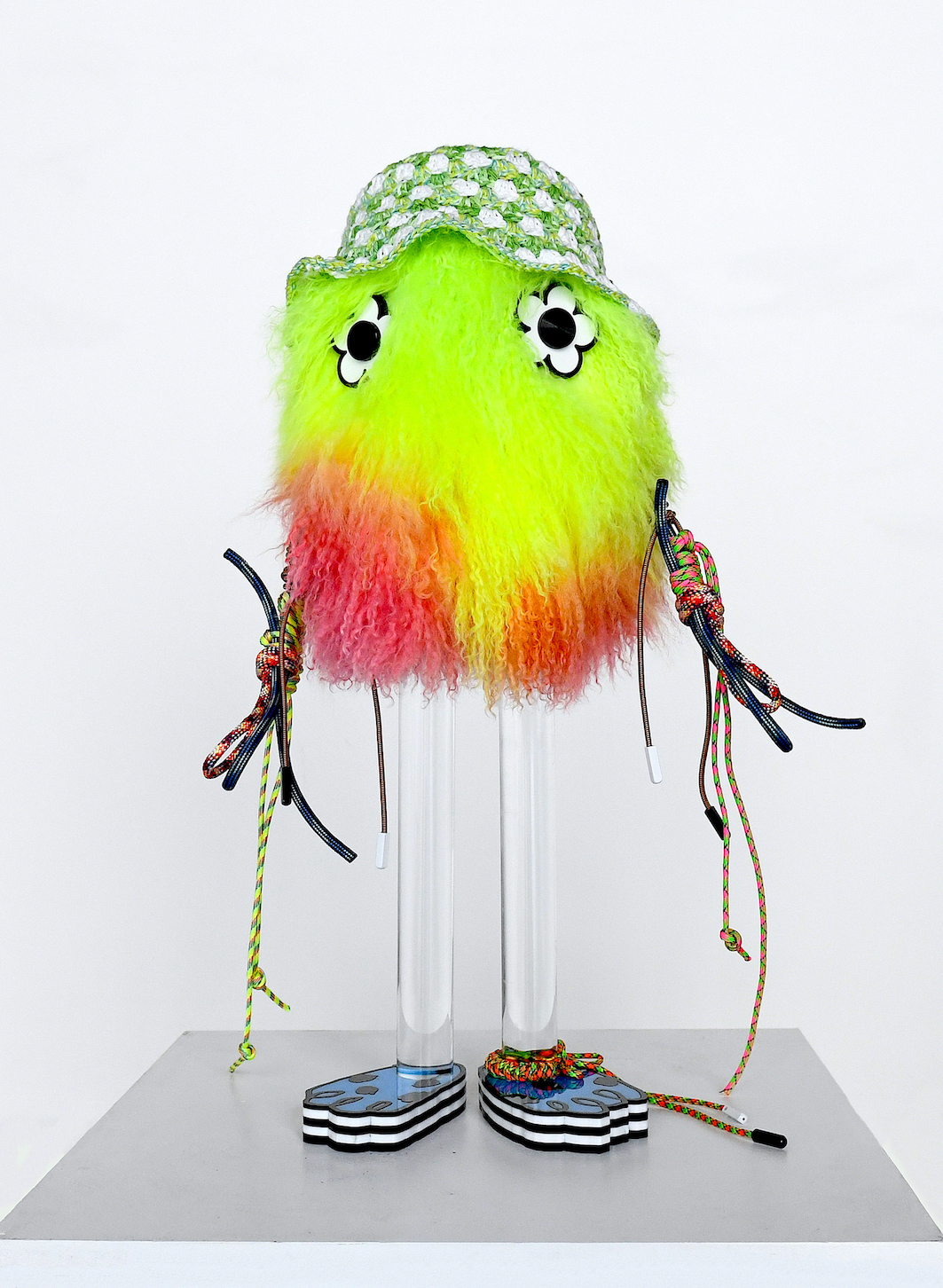 66 x 25 x 25 cm, Hand dyed Tibetan Lamb, Acrylic rods, Crochet Bucket Hat and Paracord anklet, 2024