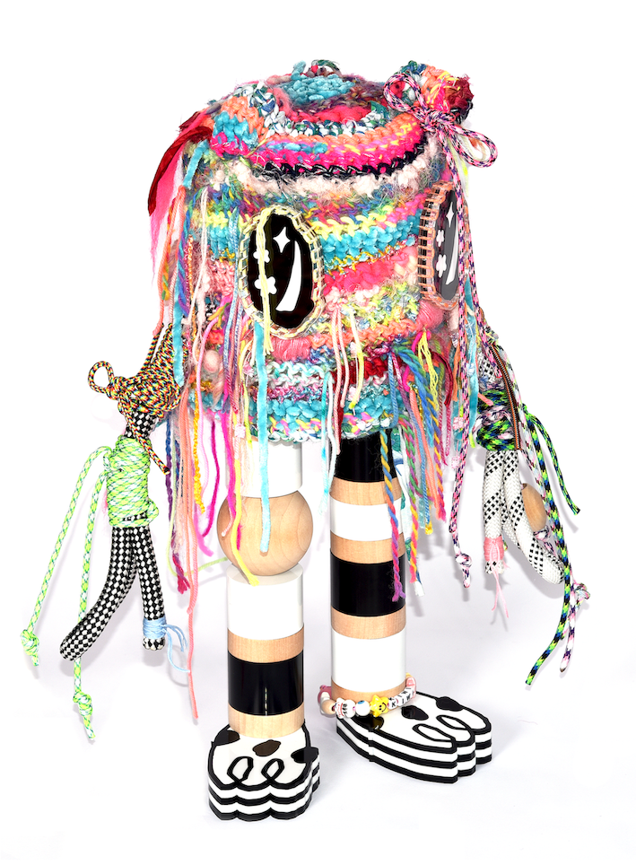 56 x 19 x 24 cm, crochted cotton, wool and synthetic varns, powder coated stainless steel, paracord, laser cut acrylic, 2025.