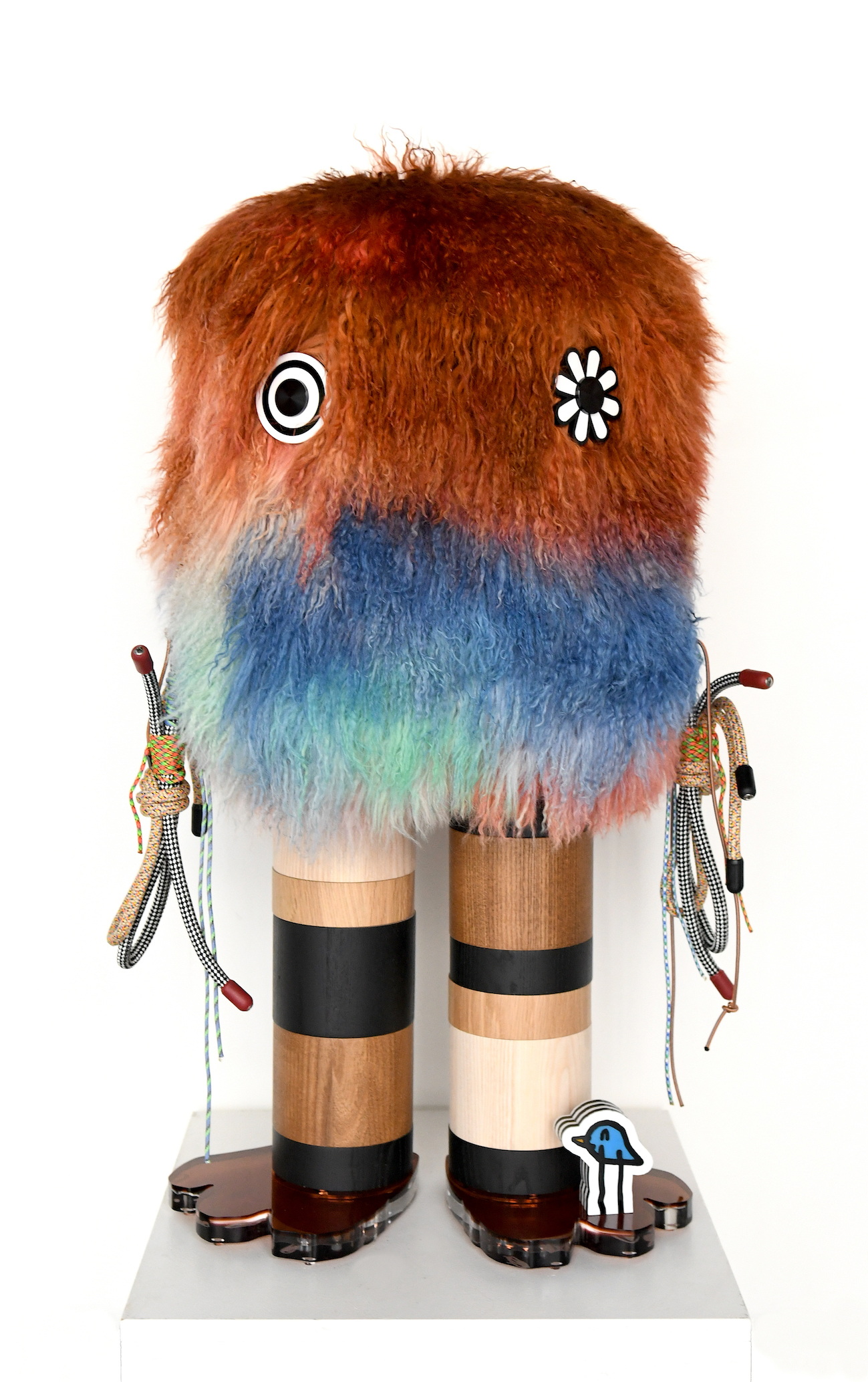 91 x 51 x 51 cm, Hand dyed Tibetan Lamb, Varied wood species (Oak, Teak, Walnut), CNC routed and etched acrylic and Memphis Bird, 2024.