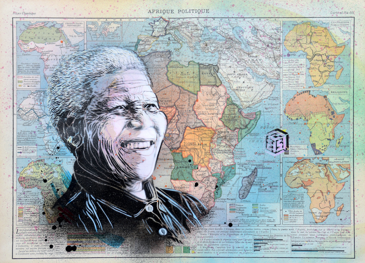 Stencil and spray paint on vintage school map (paper), 31 x 42,5 cm, 2021