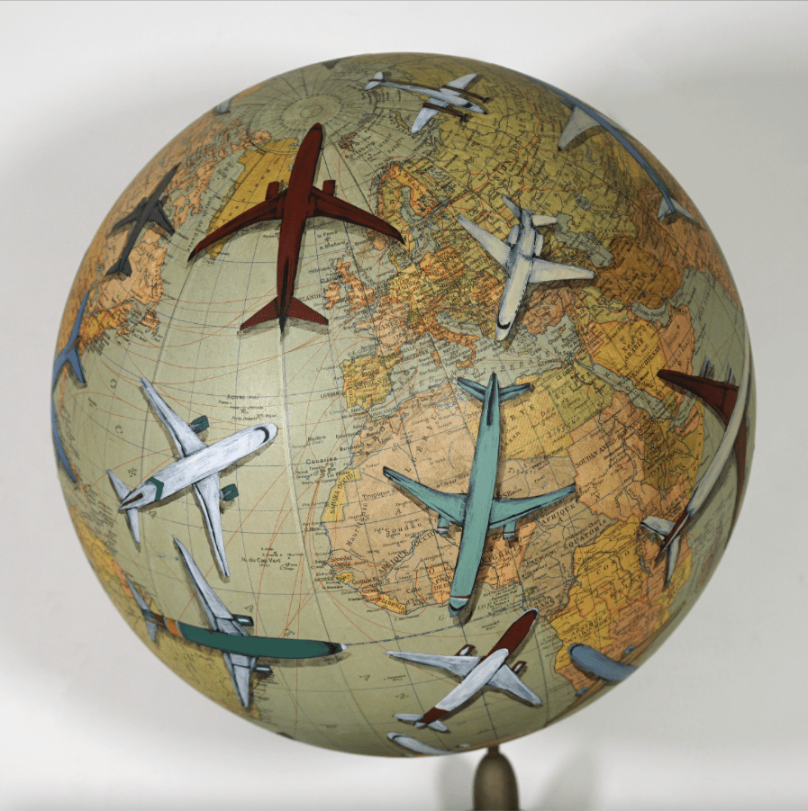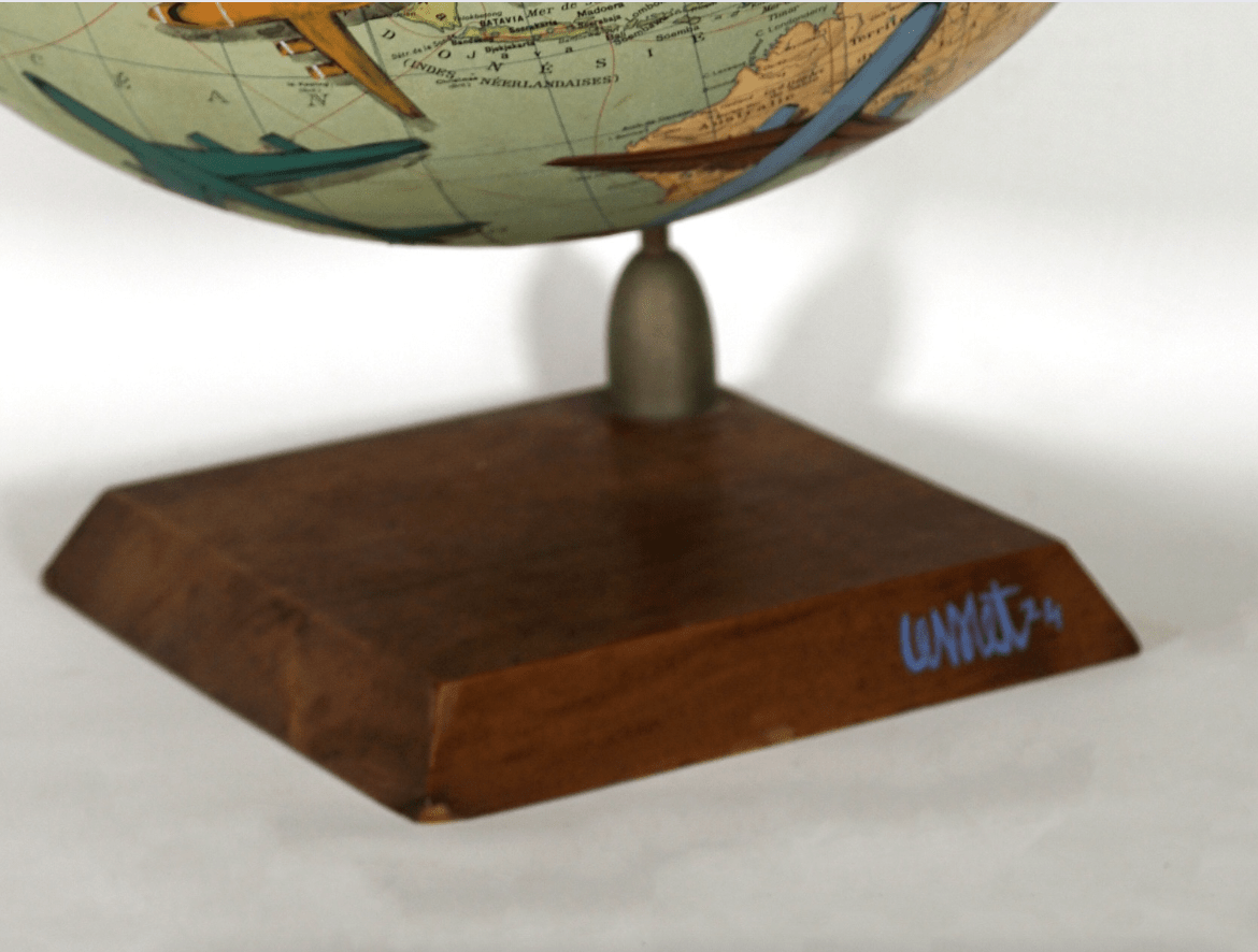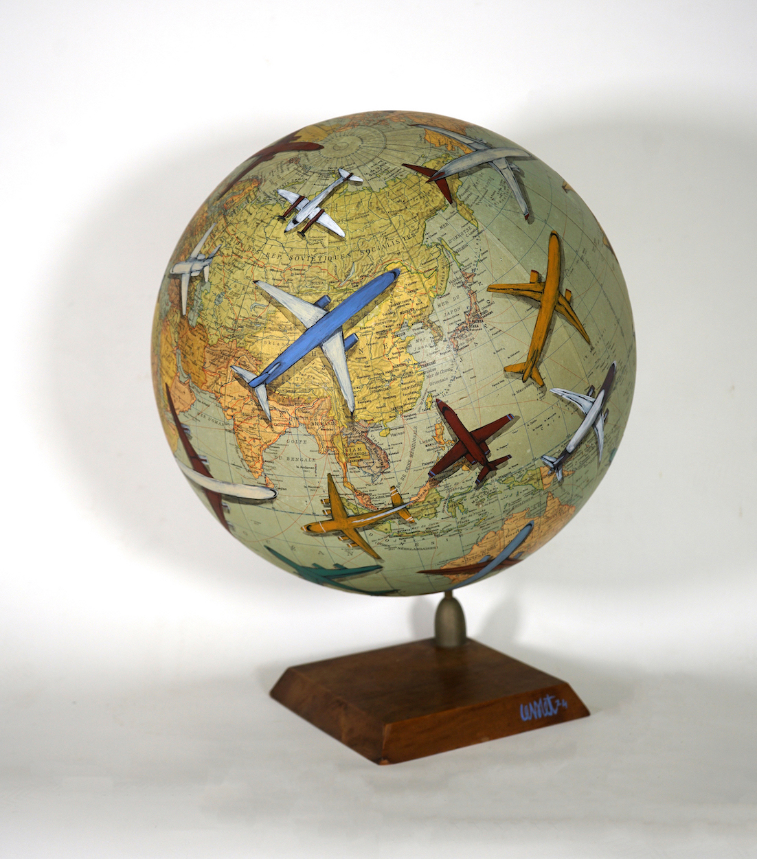 Acrylic painting on paper and collages on vintage globe, 44 x 30 x 30 cm, 2024.