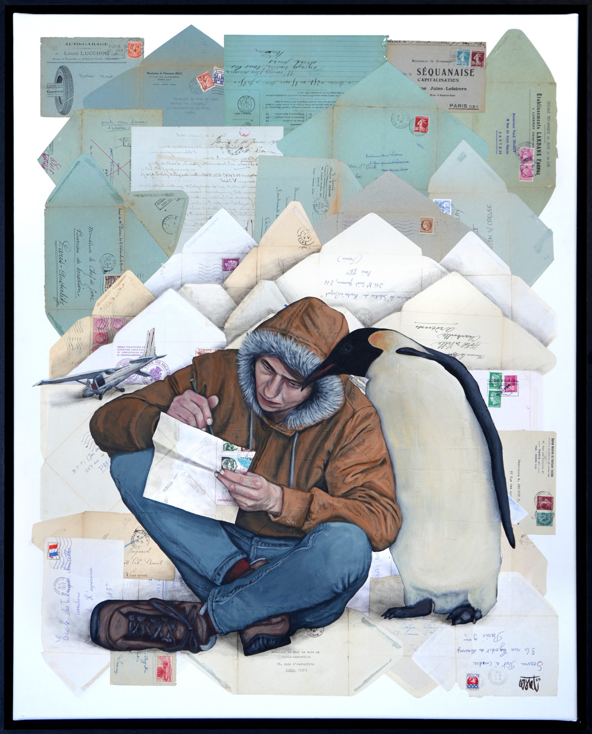 collage d’enveloppes anciennes et acrylique sur toile, 100 x 80 cm, 2025