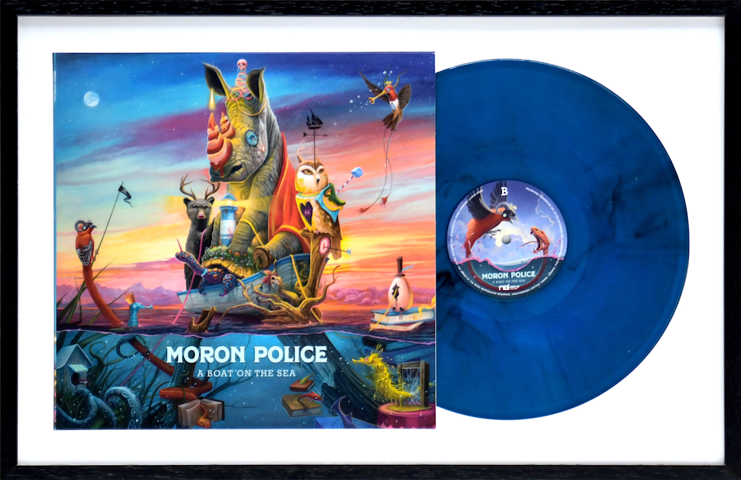 Vinyl du groupe norvégien Moron Police « A Boat on The Sea » Art cover par le street artiste espagnol Dulk Edition limité Disque bleu « marbré » 2020 (Vendu non encadré) « A Boat on the Sea » est le troisième album du groupe norvégien Moron Police, toujours aussi incompréhensible. Cette fois, ils ont délaissé leurs origines métal pour se concentrer sur un son de rock progressif/pop, tout en conservant leur style éclectique de musique qui mélange les genres.