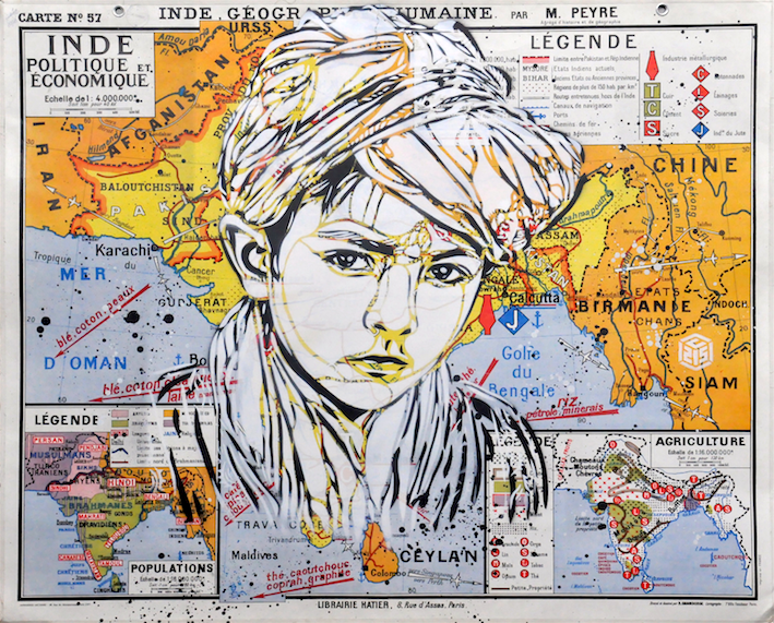 Pochoir et aérosol sur carte scolaire ancienne, 100 x 120 cm, 2019