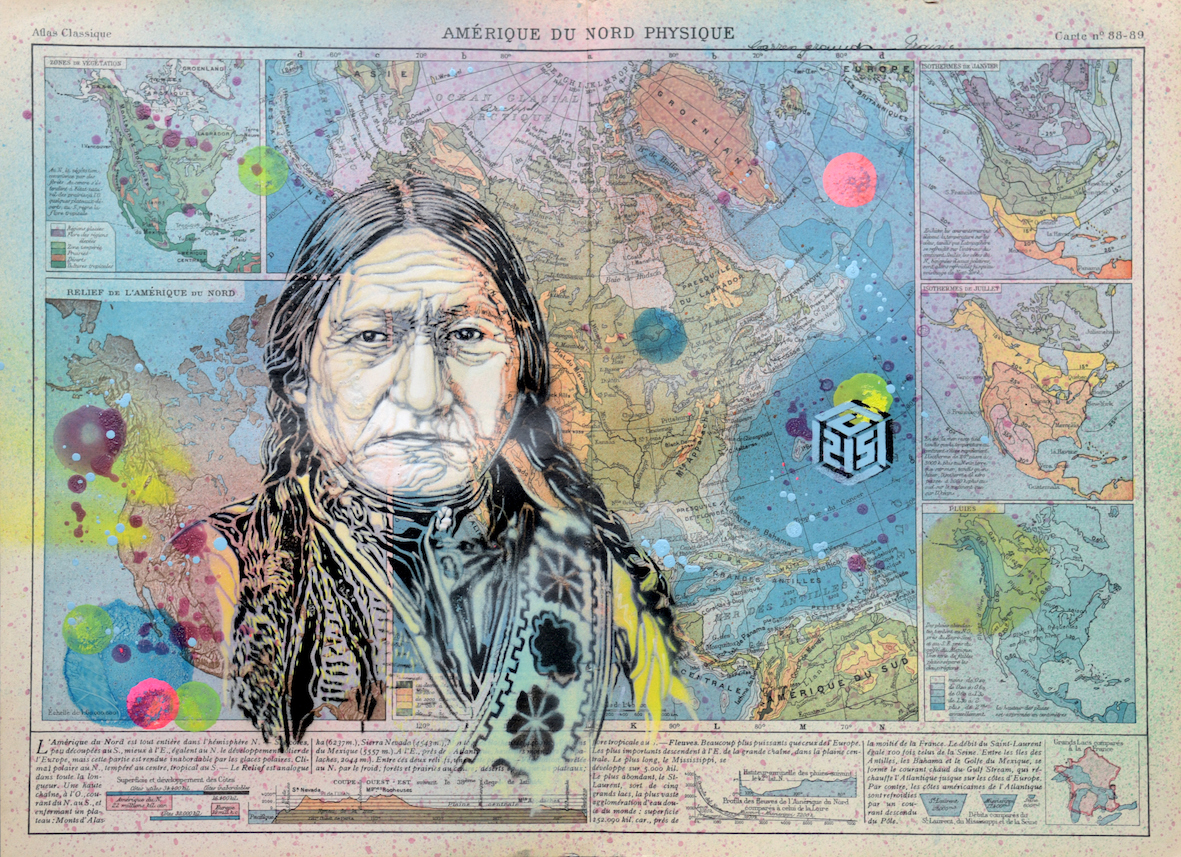 Pochoir et aérosol sur carte scolaire ancienne (papier), 31 x 42 cm, 2021