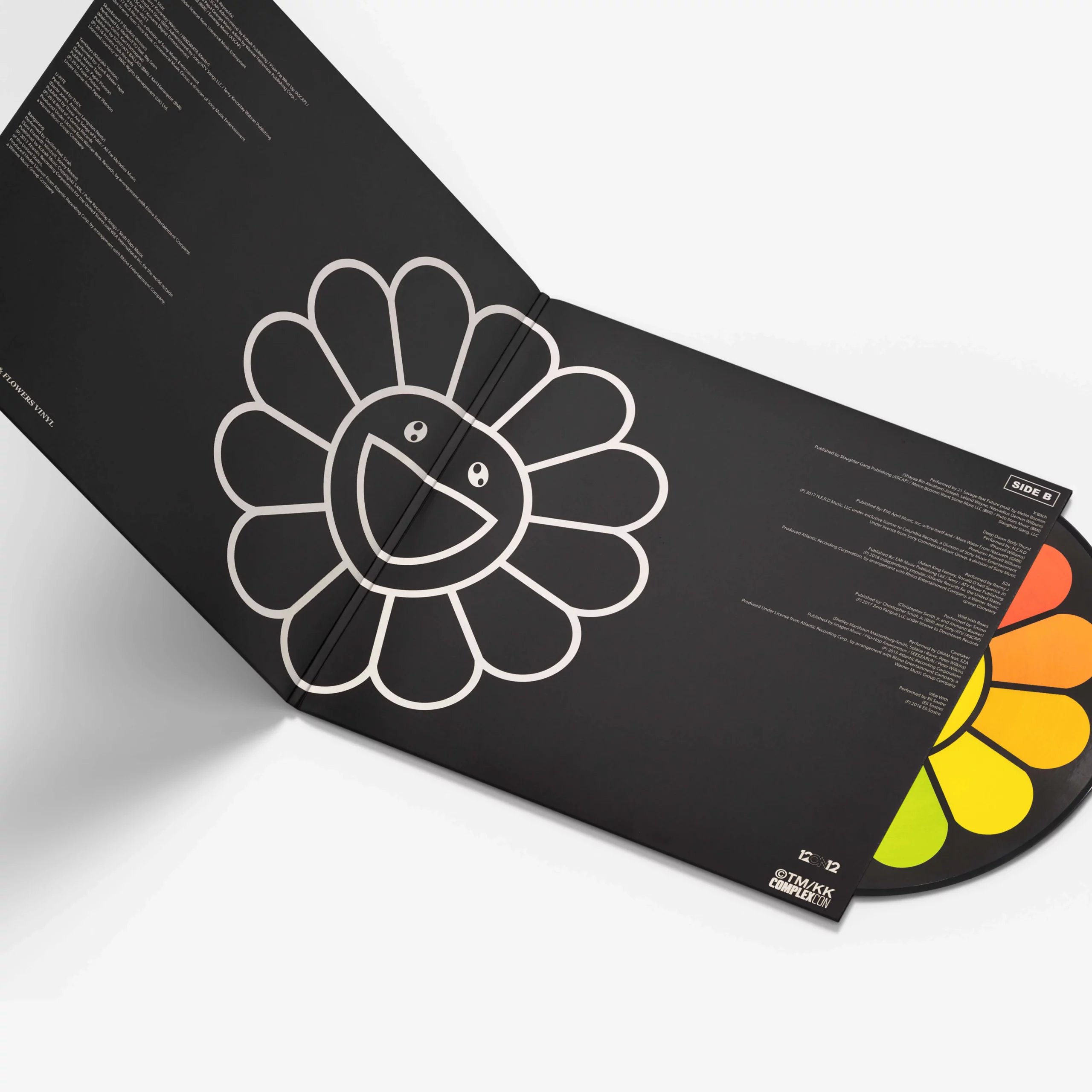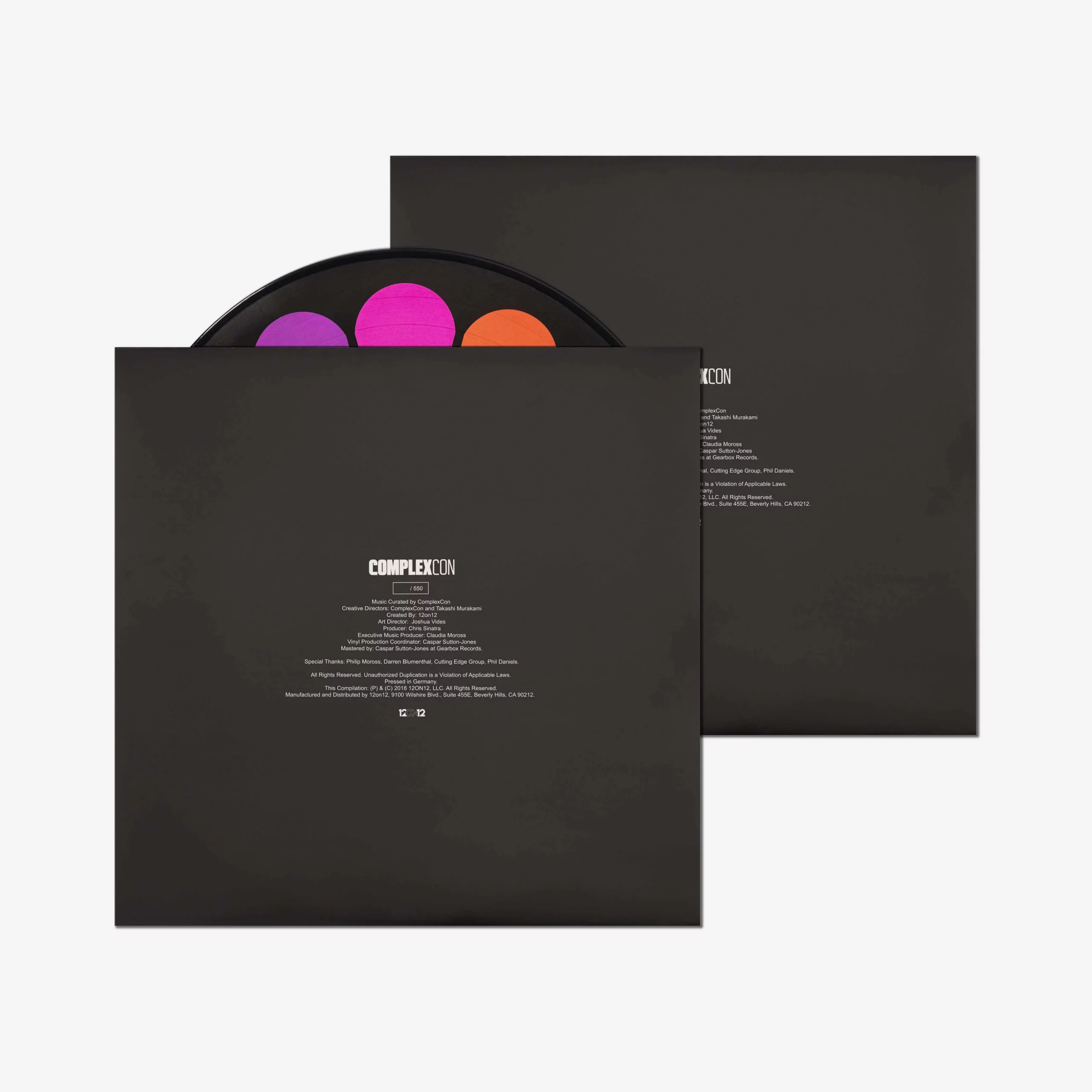 Picture disc vinyle double face Edition de 550 exemplaires numérotés à la main 2018 (Vendu non encadré) 12on12 a créé une édition limitée de « vinylwork » pour l’événement dans le cadre de l’édition spéciale de drops exclusifs, reprenant l’œuvre d’art iconique de Takashi Murakami. Murakami, membre du comité organisateur du ComplexCon, a supervisé l’identité et l’esthétique générale du ComplexCon. La BO du ComplexCon comprend certains des moments et des performances les plus mémorables de l’histoire du ComplexCon, avec des artistes comme Skrillex, 21 Savage, N*E*R*D et bien d’autres…